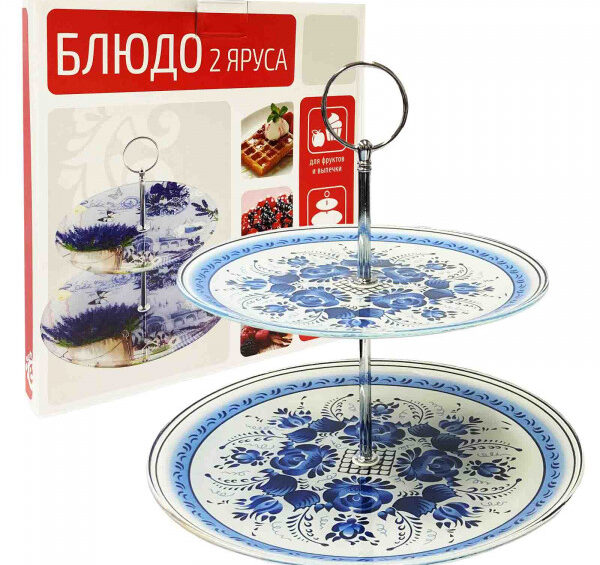 Двухъярусная стеклянная тарелка “Гжель” (Ø 25/20 см)