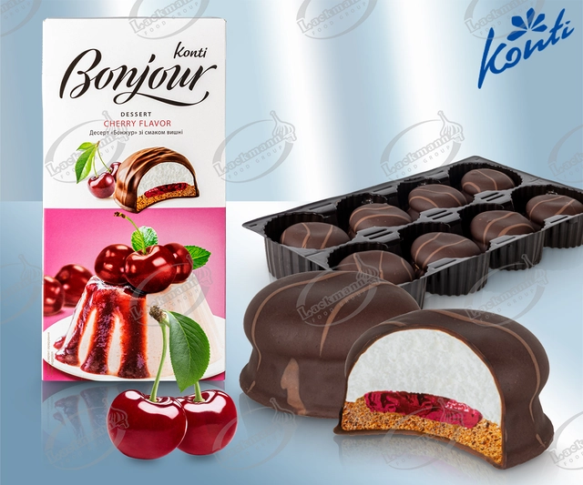 Состав: сахар, сироп из кукурузного крахмала, пшеничная мука, пальмовое масло полностью гидрогенизированные, какао порошок обезжиренное, пальмовое масло, регулятор влажности: (сорбит), Регуляторы кислотности: (E330, E331), сывороточный продукт, желирующее вещество: (пектин), Эмульгаторы: (E492, E476, E475, E471, E322 (соя), E322 (подсолнух)), средство для повышения сыпучести порошков: (E570), (E1520, регулятор влажности: E476), концентрат вишневого сока, пищевая соль, Разрыхлитель теста: (E503, E500), ароматизаторы, Краситель: (кармин), консервирующее вещество: (E202), ароматизатор. Данный продукт может содержать следы: Арахис, Орехи.